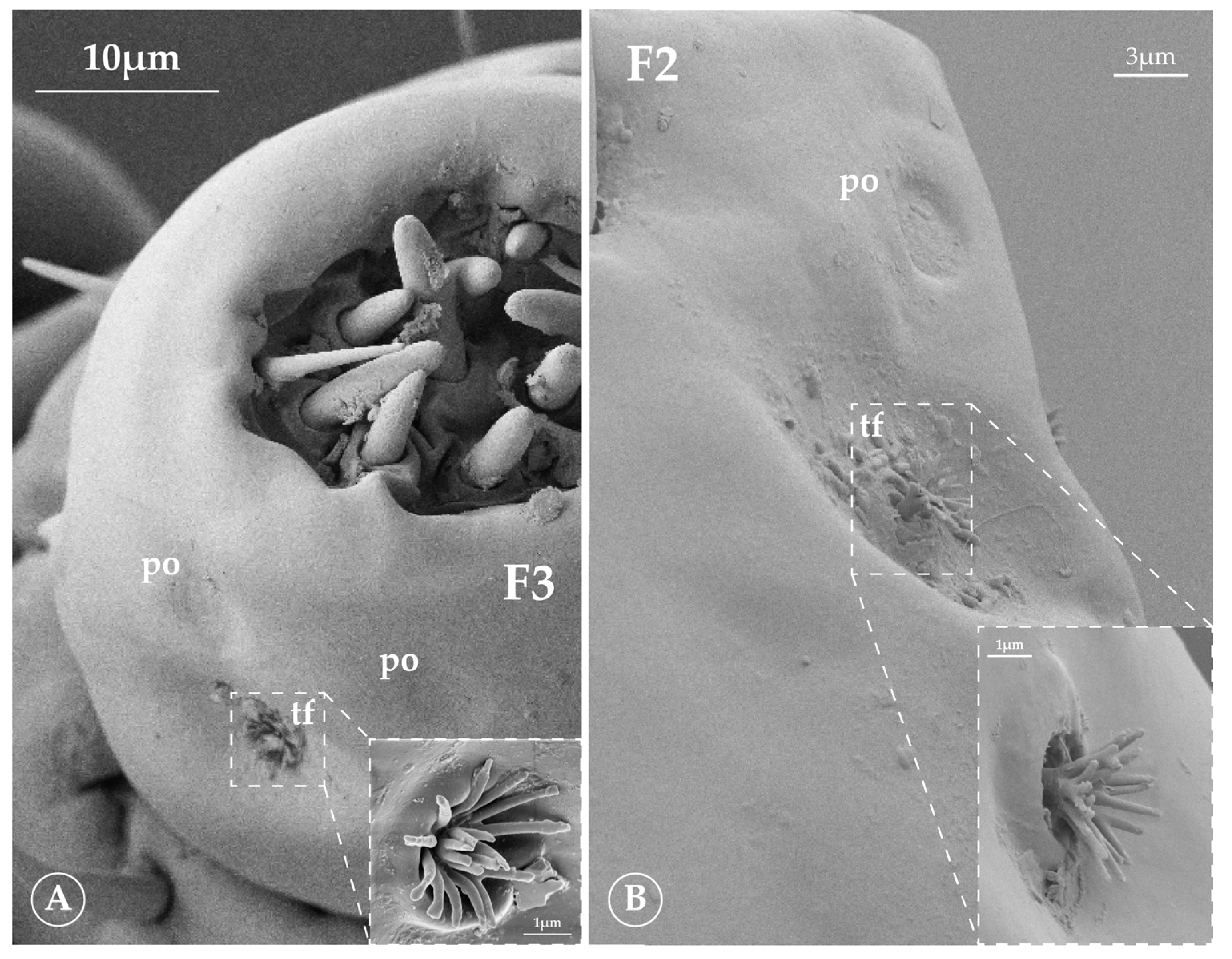 - Ren, C.-S.; Chang, Z.-M.; Zu, Z.-Y.; Han, L.; Chen, X.-S.; Long, J.-K. Comparison of morphological characteristics of antennae and antennal sensilla among four species of bumblebees (Hymenoptera: Apidae). Insects 2023, 14, 232. [Google Scholar] [CrossRef]