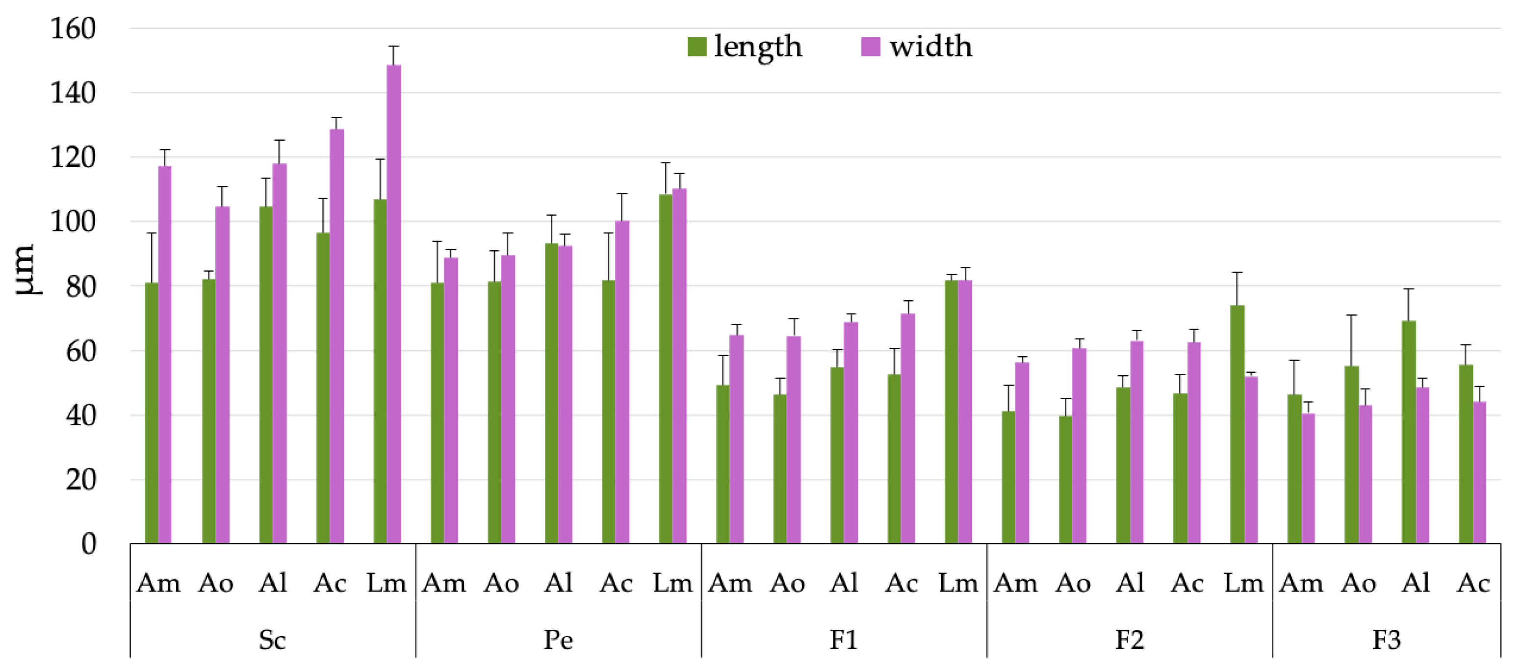 | Sc | Squamiformia | 33.28 ± 4.97 | 30.43 ± 6.54 | 31.65 ± 5.61 | 34.57 ± 5.24 | 23.4 ± 1.54 | |