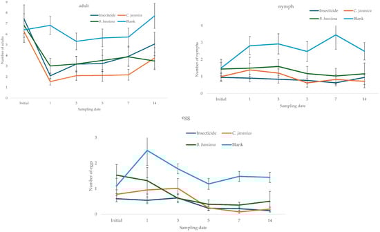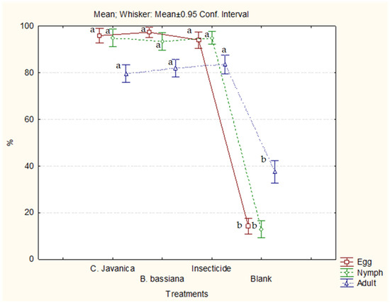 Statistically significant differences were recorded between the efficiencies of the treatments on eggs (H = 400.50, p < 0.0001), nymphs (H = 315.97, p < 0.0001), and adults (H = 209.67, p < 0.0001). Statistically significant differences were observed between the pesticides in the control of the egg, nymph, and adult stages; however, no significant difference was found between the biopesticides and the commercial insecticide (Figure 2).