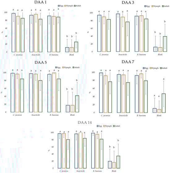 Efficiency of pesticides with respect to day after application (DAA) against eggs, nymphs, and adults of whitefly on eggplants in a greenhouse. Means with the same letter are not significantly different (p > 0.05).