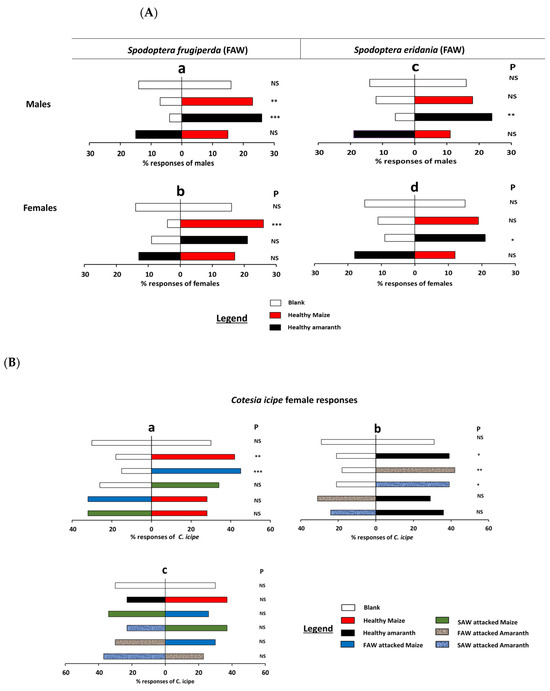 Olfactometer responses of Spodoptera frugiperda, Spodoptera eridania, and Cotesia icipe to maize and amaranth odors. (A) = S. frugiperda, and S. eridania males and female responses to headspace volatiles of healthy maize and amaranth plants. (a) S. frugiperda male responses, (b) S. frugiperda female responses, (c) S. eridania male responses, (d) S. eridania female responses. (B) = Cotesia icipe responses to headspace volatiles of healthy and infested maize and amaranth plants. (a) C. icipe female responses to maize volatiles, (b) C. icipe female responses to amaranth volatiles, (c) Choice of C. icipe between maize and amaranth odors. Males/females of the pests (3–4 days old), and females C. icipe (2–5 days old) were tested individually for a choice between blanks and odors from healthy maize and amaranth, and attacked plants. The letters a–c on the left side of Figure 2 and Figure 3 are the concentrations of each component used (Table S2A). Asterisks indicate significant difference levels: * p < 0.05, ** p < 0.01, *** p < 0.001. P = probability, NS = non-significant.