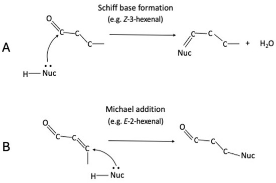 Simplified reaction schemes of different aldehydes with nucleophiles. Schiff base formation with Z-3-hexenal (A) and Michael addition with E-2-hexenal (B) with a nucleophile are likely mechanisms.