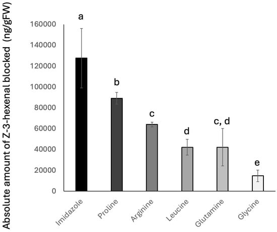 Inhibition of Z-3-hexenal (Z3al) production in maize (Zea mays) leaf tissue by amino acids. All amino acids were used at the same concentration. Shown are the amounts of Z-3-hexenal that are blocked in the presence of the amino acids and imidazole. Different letters above each bar indicate statistical differences determined by ANOVA analysis, followed by Tukey tests where appropriate (p < 0.05). N ≥ 3, error bars represent standard deviation.