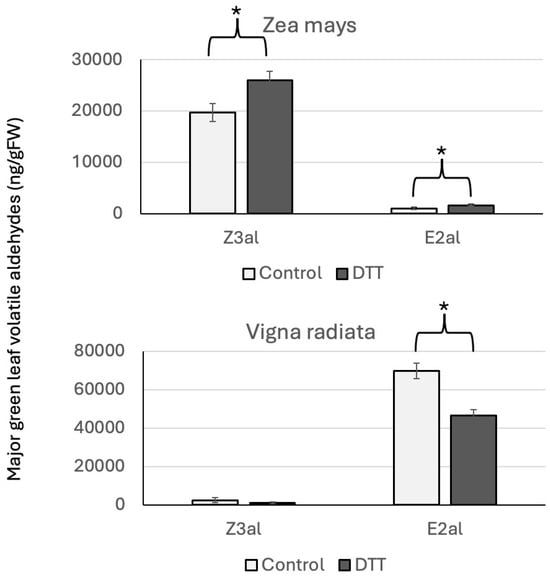 Effects of dithiothreitol on aldehyde GLV production in maize (Zea mays) and mung bean (Vigna radiata). * denotes significant differences (t-test, p ≤ 0.05). N ≥ 3, error bars represent standard deviation. DTT, dithiothreitol; Z3al, Z-3-hexenal; E2al, E-2-hexenal. Note that maize is a Z3al emitter while Vigna predominantly produces E2al.