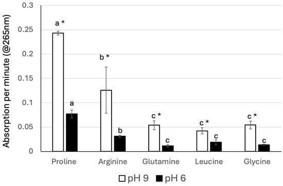 Reaction of Z-3-hexenal with selected amino acids. All amino acids were used at the same concentration as described in the Materials and Methods. N = 3, error bars represent standard deviation. Different letters above each bar indicate statistical differences determined by ANOVA analysis, followed by Tukey tests where appropriate (p < 0.05). * Denotes significant differences between pH 9 and pH 6 assays (t-test, p ≤ 0.05).