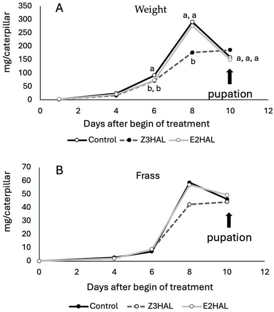 Since Z3al can directly react with an array of amino groups, we wanted to study the effects of Z3al on insect herbivore performance by adding it to the artificial diet. Studies on plant mutant lines, which are depleted in this pathway, have shown that strongly reduced levels of GLV are beneficial for insect performance on these plants when compared to normal GLV-producing wild types. However, insect herbivores also apply elicitors abundant in their saliva to the plant, which in turn, activate a wide array of defensive measures [28]. These may then interfere with the assessment of herbivore performance on both GLV-depleted and normal plants. We therefore decided to perform an assay that is free of the activation of other plant defensive pathways. Since BAW caterpillars are normally reared on an artificial diet, we added Z3al and E2al to the diet. The control diet was without the addition of any other compound. After letting the diet rest for 1 day, we then provided it to first instar BAW caterpillars. The weight and developmental status of the caterpillars were monitored every second day. Also, the frass of the caterpillars was measured. Over the first 4 days, no significant differences were found (Figure 6A). Weight was statistically similar in all three groups of BAW caterpillars. However, beginning on day 6, we found significant differences in the weight of the caterpillars. Control caterpillars showed more weight at this time point (91.1 mg/caterpillar), while both caterpillars on the Z3al- and E2al-containing diets were lower in weight (70.9 and 72.6 g/caterpillar, respectively). On day 8, caterpillars on control and E2al-diet were similar with regard to their weight gain (301.9 and 275.8 mg/caterpillar, respectively). At the same time, caterpillars on the Z3al diet were significantly lower in weight (176.7 mg/caterpillar). On day 10, which marked the beginning of pupation, all three treatment groups had the same weight again (Figure 6A). However, while the control and E2al group went through a significant weight loss between days 8 and 10, just before the onset of pupation, the Z3al-treated caterpillars did not go through this process but rather entered pupation with their maximum weight. Pupae in all groups did not show any differences in weight when analyzed on day 15