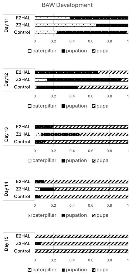 From day 10 after the start of the experiment, we focused mainly on the insect development in the three treatment groups (Figure 7). Between day 11 and day 12, we found no significant differences between the control group and the E2al group regarding the onset of pupation. However, on day 12, a shift was observed between these two treatments. While the number of BAW at the caterpillar stage remained similar between control and E2al-treated, the onset of pupation changed. E2al-treated caterpillars developed from here on slower and more like the Z3al-treated ones. In contrast, caterpillars reared on the Z3al diet were significantly delayed in their development right at the beginning of this developmental process (Table S1 for statistical details). While 74% of caterpillars in the control group were already in the process of pupation, only 34% of the Z3al group had entered this stage. On day 13, 90% of control caterpillars were already pupated, but only 51% of the Z3al group. On day 15, all of the control group caterpillars as well as the E2al caterpillars were pupated; however, 7% of the Z3al group were still in the process of pupation (Figure 7). It appears as if a diet spiked with E2al does not deter caterpillars from consuming similar to those of the control group, but it still has a negative effect on later developmental processes. This may in part explain why certain caterpillars possess an isomerase in their saliva [12,13,16,17]. And while this isomerase is not specifically aimed at the conversion of Z3al to E2al [29], it may still help to avoid the more immediate deterring effects of Z3al. However, it does not seem to reduce the negative effects of aldehyde GLV on the development of BAW caterpillars during metamorphosis, as shown for E2al herein.