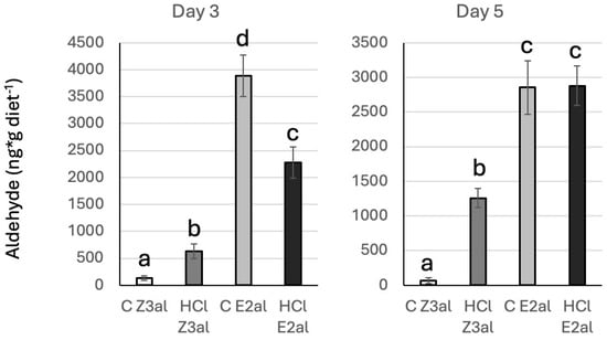 Analysis of Z-3-hexenal (Z3al) and E-2-hexenal (E2al) in the artificial diet. Samples were analyzed on day 3 and day 5 after the respective aldehyde was added to the diet. Different letters above each bar indicate statistical differences determined by ANOVA analysis, followed by Tukey tests where appropriate (p < 0.05). C, control, HCl, hydrolyzed with hydrochloric acid.