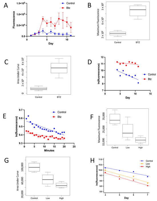 g in a 4 °C cold room. The supernatants from the 3 replicates were pooled and then diluted 1:4 in the buffer solution. Next, 180 µL aliquots of the diluted extract were added to black 96-well plates (Greiner Bio-One 82050-728, Kremsmünster, Austria), and 20 µL of either pure ethanol (control) or 250 µM Bortezomib (experimental group) was added to each sample. Purified recombinant eGFP (Cell Biolabs STA-201, San Diego, CA, USA) at 1 mg/mL in PBS was diluted 1:5, 1:10 and 1:15 with PBS, and 200 µL of each sample was loaded into the plate in duplicate as controls. This plate was then introduced to the plate reader pre-warmed to 37 °C. GFP fluorescence was quantified using the BioTek Synergy H4 Hybrid Multi-Mode Microplate Reader (Agilent, Santa Clara, CA, USA) in the USC Dornsife NanoBiophysics Core facility (Los Angeles, CA, USA). Readings were taken at 30 s intervals at 395 nm excitation/510 nm emission to detect GFP fluorescence.