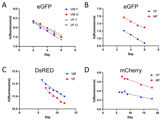 28]. The half-life of DsRED increased rapidly between eclosion and day 12 of age, with statistically significant increases detected for each of virgin females, mated females, and virgin males. In the future, it may be of interest to ask if the half-life of DsRED continues to increase at greater ages.