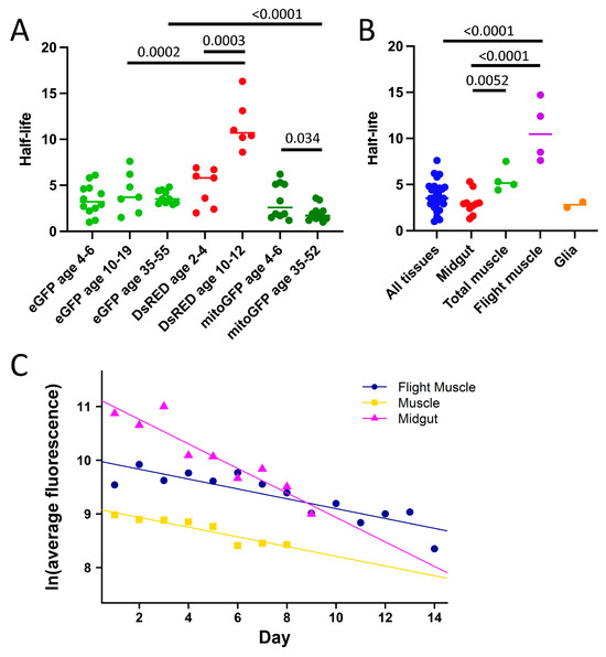 Half-life also varied by tissue, with greater eGFP half-life observed in muscle relative to other tissues. Cytoplasmic eGFP had a similar half-life in young flies when expressed in a tissue-general pattern and when targeted to midgut enterocytes and to glial cells (summarized in