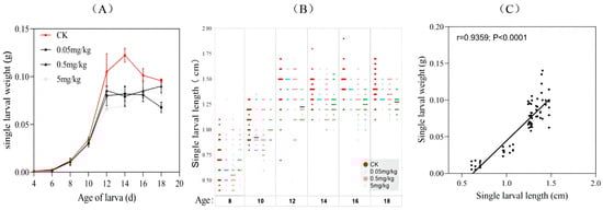 For each group, which had three replicates, a round plastic box with a diameter of 9.8 cm and a height of 10 cm was employed as the experimental container. To ensure consistency and minimize initial differences both within and between groups, the 200 four-day-old larvae in each replicate were weighed to determine the starting average larval weight. During the experiment, every two days, 10 larvae were randomly selected from each replicate. These larvae were weighed, and their lengths (from age 8) were measured. Subsequently, they were returned to their respective containers. To assess whether there were statistically significant differences among the treatments, a one-way analysis of variance (ANOVA) and the least-significant difference (LSD) multiple comparison test were conducted using GraphPad Prism software (GraphPad Software Inc., San Diego, CA, USA).