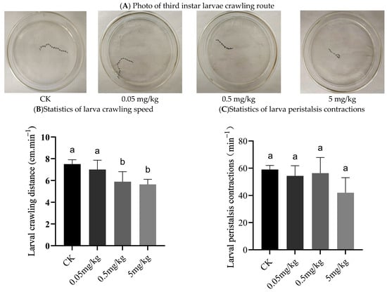 Crawling behavior of third instar larvae: (A) photo of third instar larvae crawling route; (B) statistics of larva crawling speed; (C) statistics of larva peristalsis contractions. Columns marked by the same small letter do not significantly vary (p > 0.05).