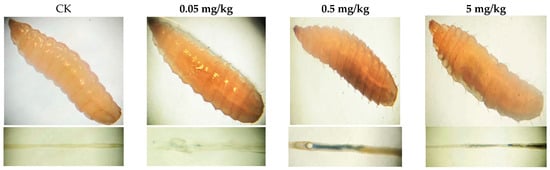 Third-instar larvae were randomly collected from the CK and different acrylamide-contaminated groups. Subsequently, the larvae were washed with PBS and stained with a 0.02% Trypan blue solution at room temperature for 30 min while being shaken on a shaker at 40 revolutions per minute (r/min). After staining, the treated larvae were rinsed with PBS to remove the excess dye. Finally, the staining degree was observed under a stereomicroscope to assess the extent of intestinal cell damage, following the method described by Pappus et al. [23]. In each experimental condition, a total of 90 larvae from three replicates were treated.