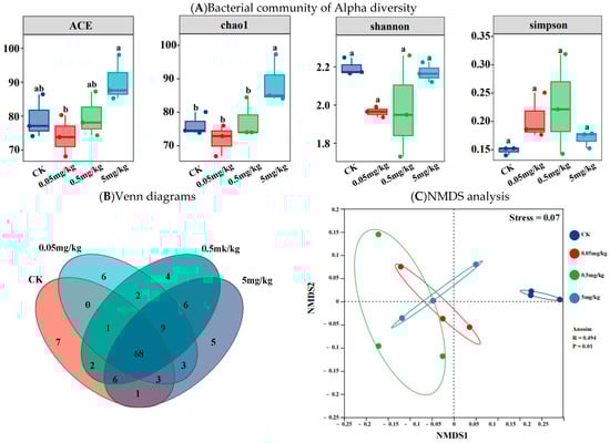 Bacterial community of Alpha diversity (A), Venn diagrams (B), and NMDS analysis (C) based on the Bray–Curtis distance of the BSFL gut for different treatments. Results marked by the same small letter do not significantly vary.
