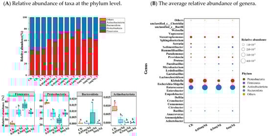 (A) Relative abundance of taxa at the phylum level. Bacterial OTUs counted below 0.1% of the total reads were categorized into ‘Others’. (B) The average relative abundance (n = 3) of genera. Results marked by the same small letter do not significantly vary.
