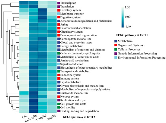 The potential functional profiles of the gut bacterial community were analyzed via KEGG pathways. When compared to the CK, acrylamide was found to affect the predicted functional profiling. Specifically, there was a reduction in the predicted organismal systems, encompassing the digestive system, aging-related functions, environmental adaptation, circulatory system, development and regeneration, and immune system (Figure 6). Moreover, acrylamide led to a decline in metabolic functions, such as xenobiotic biodegradation and metabolism, along with nutrient metabolism, including lipid and carbohydrate metabolism. Notably, the influence of acrylamide on KEGG pathways varied according to its concentration. For the majority of the secondary KEGG pathways within the metabolism system, environmental information processing, cellular process, and genetic information processing, the effects exhibited a decreasing trend as the acrylamide contamination concentrations increased (Figure 6 and Figure S1). Furthermore, a correlation analysis based on Spearman’s correlation coefficients was carried out to explore the co-occurrence of the identified predicted functions within the organismal systems cluster and gut bacteria at the genus level. The results indicated a significant negative correlation between Enterococcus and most of these functions. In contrast, Klebsiella, Citrobacter, Cronobacter, Microbacterium, Pseudomonas, Serratia, and Stenotrophomonas were significantly positively correlated with most of these functions (Figure S1A). It is worth noting that Paenibacillus was negatively correlated with axon regeneration.