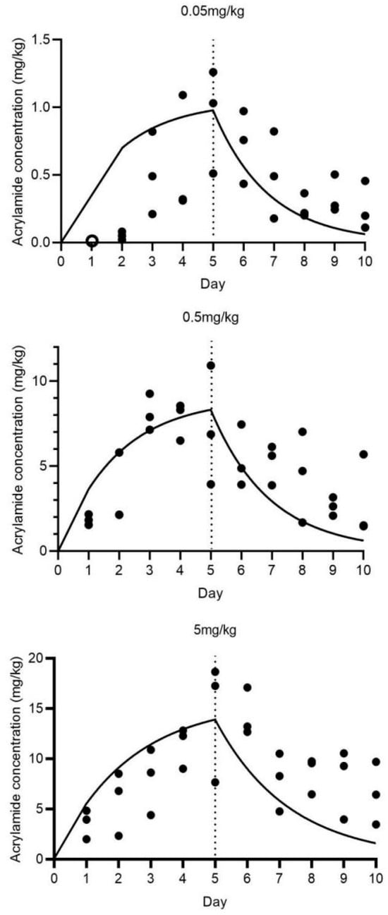 Uptake and elimination kinetics of acrylamide in BSFL exposed to 0.05, 0.5, and 5 mg/kg for 5 days, plus 5 days in a clean substrate. Note: Circle points represent data not considered in the toxicokinetic modeling. Solid lines show the fit of a one-compartment model with growth dilution. The dashed vertical line defines the last day of exposure to the contaminated substrate, ending the uptake and starting the elimination phase of the experiment.
