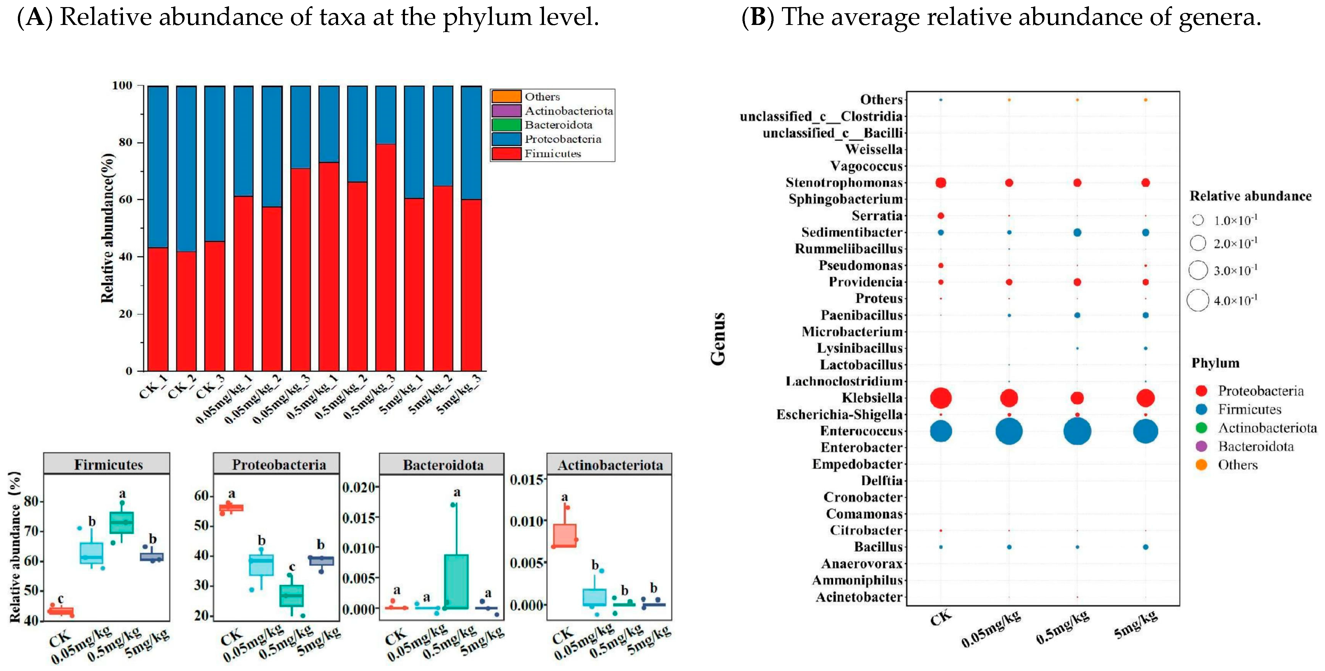 Firmicutes and Proteobacteria, accounting for more than 99% of all microorganisms, were the most prevalent phyla in the larval intestines of all treatment groups. The relative abundance of Firmicutes in the CK was significantly lower (average 44%) compared to the acrylamide-contaminated groups (average 63%, 73%, and 62% for the 0.05 mg/kg, 0.5 mg/kg, and 5 mg/kg groups, respectively; p < 0.05). Conversely, the relative abundance of Proteobacteria in CK (average 56%) was significantly higher than that in the acrylamide-contaminated groups (average 36%, 26%, and 38% for the 0.05 mg/kg, 0.5 mg/kg, and 5 mg/kg groups, respectively; p < 0.05) (Figure 5A). Moreover, compared to the acrylamide-contaminated groups, the abundance of Actinobacteria in the larval intestine of CK was significantly higher (p < 0.05). At the genus level (Figure 5B), acrylamide treatment induced remarkable changes in the gut microbiota composition of BSFL. The enrichment of acrylamide-tolerant genera such as Enterococcus, Escherichia-Shigella, Providencia, Acinetobacter, Lachnoclostridium, Lactobacillus, Paenibacillus, and unclassified_c__Clostridia, along with the suppression of sensitive taxa including Klebsiella, Citrobacter, Anaerovorax, Cronobacter, Microbacterium, Pseudomonas, Serratia, and Stenotrophomonas, indicated potential microbial adaptation mechanisms under chemical stress.