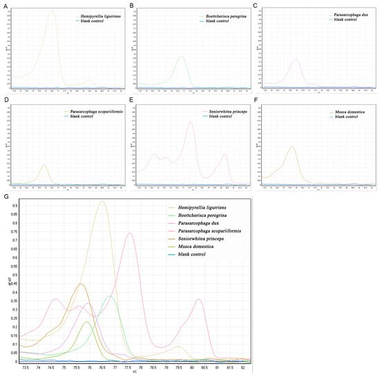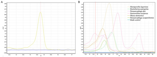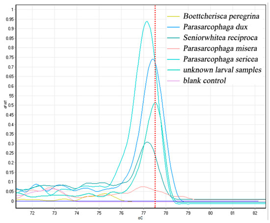 The C1-J-2495/C1-N-2800 primers amplified a total of six species, with melting curve peaks for H. ligurriens at 76.53, B. peregrina at 76.77, P. dux at 75.97, M. domestica at 75.22, and Parasarcophaga scopariiformis (Senior-White, 1927) at 75.90. Three peaks for S. princeps existed at 74.75, 77.65, and 80.32. The positions of the other two peaks did not overlap with the other peaks, and were not contaminated by other flies (Figure 2).