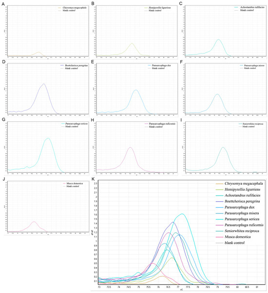 The primers, designed based on the mitochondrial COXII gene sequence of P. misera, were amplified with yielding single, species-specific melt peaks for all 10 species. The following peaks were observed: C. megacephala at 76.22, H. ligurriens at 76.70, A. rufifacies at 76.45, B. peregrina at 76.73, P. dux at 77.07, P. misera at 76.32, P. sericea at 77.20, P. ruficornis at 76.52, S. princeps at 76.88, and M. domestica at 75.70. Of these, only the Tm values of H. ligurriens and B. peregrina were close, differing by only 0.03 °C (Figure 3).