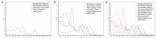 The primers obtained through literature screening, as well as the self-designed primers for HRM experiments, none—except for the above two primers—obtained better results. The rest of the primers mostly exhibited poor amplification, no amplification, or only a certain fly species produced a peak on the melting curve. Another situation is that the melting curve of the amplicon has multiple peaks, as shown in Figure 4 below, whereby the primer is COX2-365/COX2-521, the length of the amplified fragments is 157 bp, and the single peaks of the HRM experiment of the amplicon of this primer are C. megacephala, A. rufifacies, H. ligurriens, and M. domestica. Meanwhile, B. peregrina, S. princeps, P. misera, P. sericea, and Leucomyia cinerea (Fabricius, 1974) all showed multiple peaks.