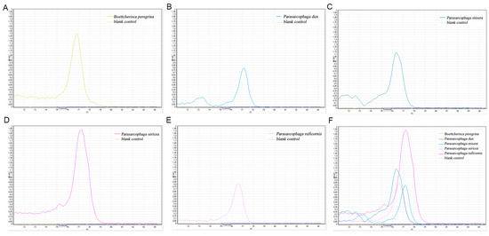 Validation of COX2-519/COX2-615 primers for identification accuracy in five species of Parasarcophaga genus. (A) B. peregrina; (B) P. dux; (C) P. misera; (D) P. sericea; (E) P. ruficornis; (F) total melting curve.