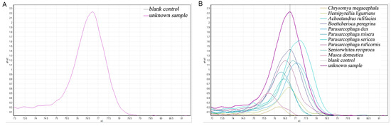 Identification of unknown flies, validating the COX2-519/COX2-615 primers. (A) Melting curves of unknown flies. (B) Comparison of unknown flies and ten other known samples.