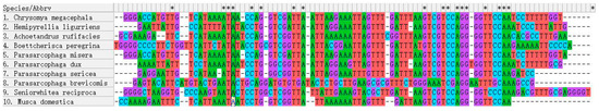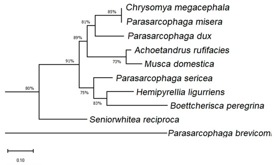 - Shi, J.; Guo, Y.D.; Kuang, X.Y.; Lan, L.M.; Cai, J.F.; Wang, H.J. Identification of sarcosaphagous Calliphorid flies by analyzing the sequence of 16S rDNA. Fa Yi Xue Za Zhi 2012, 28, 281–286. (In Chinese) [Google Scholar] [PubMed]