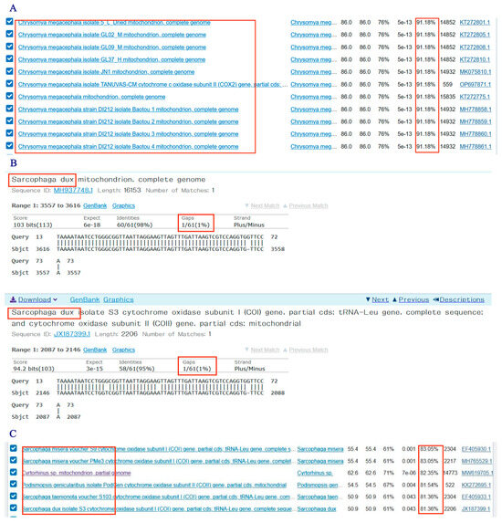 Sequencing results of COX2-519/COX2-615 PCR-HRM in NCBI. (A) C. megacephala; (B) P. dux; (C) S. princeps.