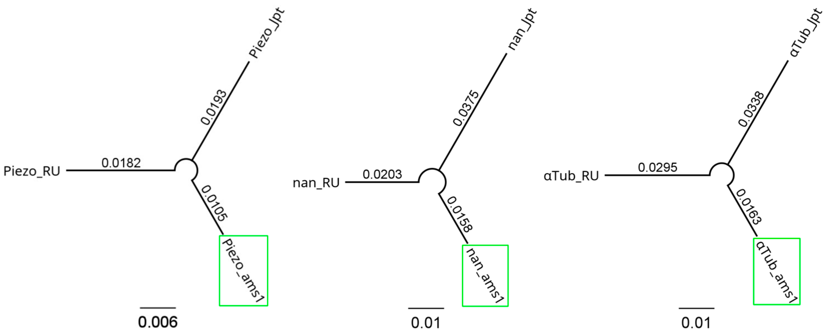 - Tamura, K.; Nei, M. Estimation of the Number of Nucleotide Substitutions in the Control Region of Mitochondrial-DNA in Humans and Chimpanzees. Mol. Biol. Evol. 1993, 10, 512–526. [Google Scholar] [CrossRef]