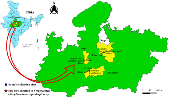 A comprehensive updated checklist of sand flies in Madhya Pradesh, central India, was documented by Shah et al. (2023) [4]. The current entomological surveillance study, part of molecular xenomonitoring of leishmaniasis across India, focused on three districts: Bhopal, Sagar, and Hoshangabad, due to reported leishmaniasis cases [12,13]. These districts provide ideal conditions for sand fly proliferation during pre-monsoon (July–August), including high humidity, rainfall, vegetation, and diverse blood-feeding hosts. This study presents the morphological and molecular description of a newly identified sand fly species, Se. (Neo.) pradeepii n. sp., from Johariya village in Sagar district.