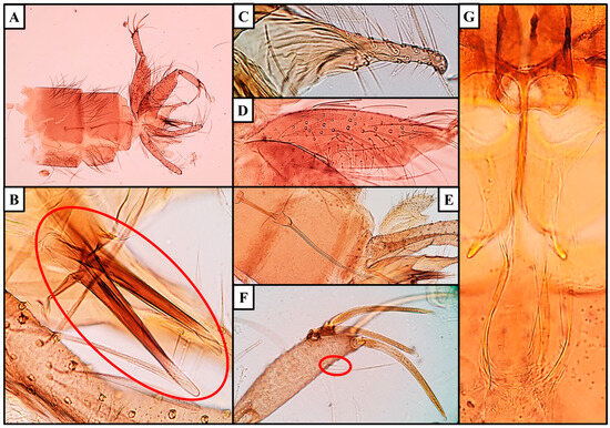 - Galati, E.A.B.; Galvis-Ovallos, F.; Lawyer, P.; Léger, N.; Depaquit, J. An Illustrated Guide for Characters and Terminology Used in Descriptions of Phlebotominae (Diptera, Psychodidae). Parasite 2017, 24, 1–35. [Google Scholar] [CrossRef] [PubMed]