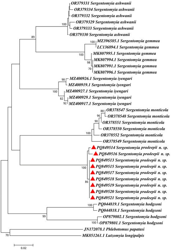 Phylogenetic analysis of mitochondrial Cytochrome c oxidase subunit I (COI) gene sequences for species of Sergentomyia (Neophlebotomus) pradeepii n. sp. (marked with red triangles) along with Se. (Neo.) ashwanii, gemmea, iyengari, monticola and hodgsoni; outgroup; Ph. papatasi and Lutzomyia longipalpis.