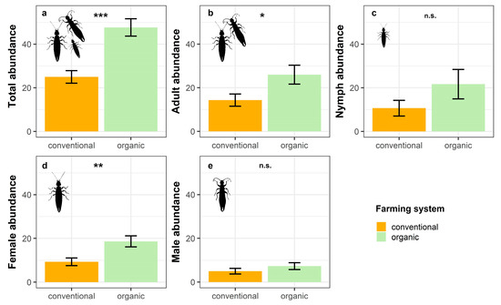 The results from the GLMs showed that total earwig abundance was significantly affected by the farming system, with organic banana groves harbouring larger numbers of E. annullipes than conventional ones (Table 2; Figure 2a). However, the benefits of organic farming differed between sexes and also varied depending on the development stage.