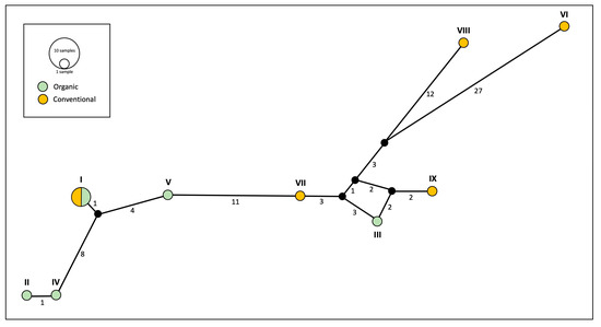 Mitochondrial (cytb) network analyses of specimens of Euborellia annulipes from organic and conventional banana groves. Numbers below the lines connecting haplotypes represent the number of mutations from one point to another. Roman numerals (I–IX) refer to the haplotype assignment for each specimen (see Table 1).