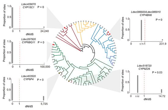 4.5. Evolutionary Selection Pressure of P450 Genes