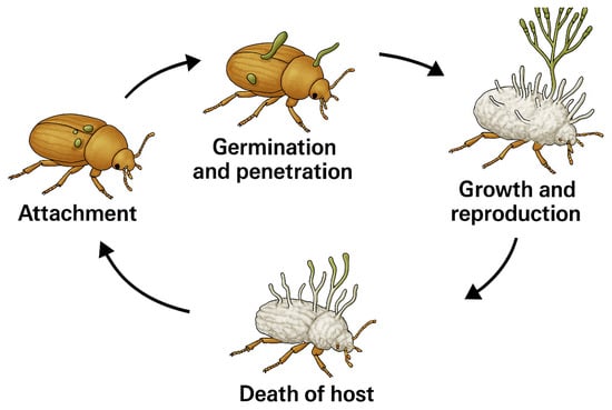 These microorganisms have emerged as important biological control agents against various insect pest species, particularly agriculture ones, such as aphids, thrips, whiteflies, and caterpillars, offering an ecological alternative to chemical pesticides []. In some cases, they exert minimal impact on non-target organisms and are compatible with other integrated pest management strategies [,]. These microorganisms primarily infect insects through their cuticle, penetrating into the hemolymph, where they produce toxic metabolites such as destruxins (produced by Metarhizium spp.) or beauvericin (produced by Beauveria spp.), that ultimately lead to host death [,]. In general, the infection cycle concludes with insect mycosis and the formation of conidia on the host surface, thus facilitating their dissemination and subsequent infection of other susceptible hosts (Figure 1).