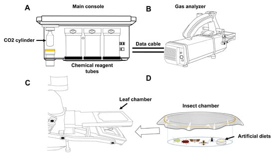 Device for measuring respiration rates of small-sized insects, using the portable photosynthesis system. (A) Main console. (B) Gas analyzer. (C) Position of the leaf chamber on the gas analyzer. (D) Insect chamber, equipped with an artificial-diet provision system. The insect chamber is inserted into the leaf chamber for gas-exchange measurements when containing experimental insects.