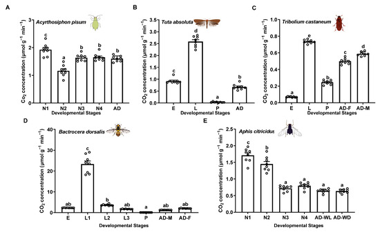 Developmental stages. Insects from different developmental stages of Ac. pisum and Ap. citricidus (first-instar nymphs (N1), second-instar nymphs (N2), third-instar nymphs, fourth-instar nymphs (N3), and three-day-old adults (AD)), Ap. citricidus (first-instar nymphs (N1), second-instar nymphs (N2), third-instar nymphs, fourth-instar nymphs (N3), three-day-old wingless adults (AD-WL), and three-day-old winged adults (AD-WL)), T. absoluta (eggs (E), larvae (L), pupae (P), and adults (AD)), B. dorsalis (eggs (E), first-instar larvae (L1), second-instar larvae (L2), third-instar larvae (L3), pupae (P), female adults (AD-F), and male adults (AD-M)), and T. castaneum (eggs (E), larvae (L), pupae (P), female adults (AD-F), and male adults (AD-M)) were collected for respiration rate measurements. For egg stages, 50 individuals were pooled per group; for larvae, pupae, and adults, 10 individuals were pooled. Each treatment included eight biological replicates.