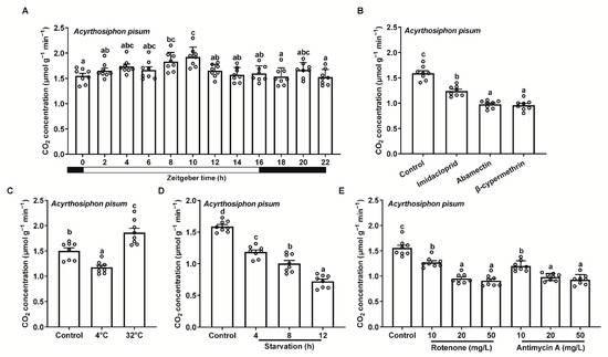 Respiration rates of Acyrthosiphon pisum under different treatments, using the portable photosynthesis-monitoring system. (A) Light/dark cycles over a full photoperiod. (B) Insecticide exposure. (C) Varying temperatures. (D) Starvation at various time points. (E) Mitochondrial inhibitors. Values represent the mean ± standard error (SE) of eight biological replicates. Lowercase letters denote statistically significant differences determined through one-way ANOVA with LSD post hoc testing (p < 0.05).