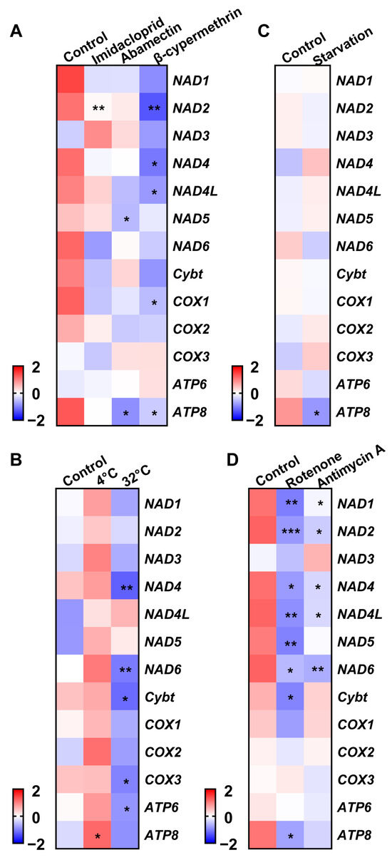 Treatment-induced changes included imidacloprid downregulating NAD2; abamectin reducing NAD5 and ATP8; and β-cypermethrin suppressing NAD2, NAD4, NAD4L, COX1, and ATP8 (Figure 4A). Low temperatures (4 °C) upregulated ATP8, while high temperatures decreased NAD4, NAD6, Cytb, COX3, and ATP6 (Figure 4B). Starvation specifically downregulated ATP8 (Figure 4C). Rotenone reduced NAD1, NAD2, NAD4, NAD4L, NAD5, NAD6, Cytb, and ATP8, whereas antimycin A suppressed NAD1, NAD2, NAD4, NAD4L, NAD6, and ATP8 (Figure 4D).