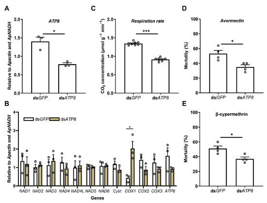 Respiration rates of Acyrthosiphon pisum under the silencing of a key mitochondrial protein-coding gene (ATP8), using the portable photosynthesis-monitoring system. Effects of ATP8 silencing on the respiration rates and stress resistance of Acyrthosiphon pisum. (A) Relative expression level of ATP8 after ATP8 dsRNA treatment. (B) Relative expression levels of other mitochondrial protein-coding genes after ATP8 dsRNA treatment. (C) Respiration rates of Ac. pisum after ATP8 dsRNA treatment. (D) Mortality of Ac. pisum under avermectin treatment upon feeding dsRNA. (E) Mortality of Ac. pisum under β-cypermethrin treatment upon feeding dsRNA. Values represent the mean ± standard error (SE) of three biological replicates for gene expression levels, eight for respiration rate, and four for mortality. Asterisks denote statistically significant differences as determined by Student’s t-test (* p < 0.05, *** p < 0.001).