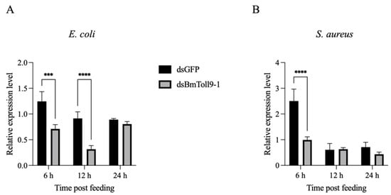 Subsequently, dsBmToll9-1- and dsGFP-treated larvae were provided with mulberry leaf disks of identical size, coated with 10 µL of E. coli or S. aureus bacterial solution [34,35]. Midgut samples were collected at 6, 12, and 24 h after feeding.