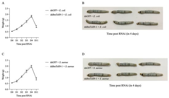 After the BmToll9-1 gene was silenced, both the larvae and cocoons exhibited a smaller and lighter phenotype [6]. However, bacterial treatment annulled the effects of dsBmToll9-1 injection over time, which manifested as reduced growth, affecting both the body weight and dimensions (Figure 2). Upon feeding on E. coli, the body weight of BmToll9-1-silenced larvae gradually recovered to match that of the control, reaching a maximum of 1.87 g (on the 4th day after the dsBmToll9-1 injection) (Figure 2A,C). Both BmToll9-1-silenced larvae and the control larvae pupated into the cocoon stage around the same time (the 4th day after the dsBmToll9-1 injection). After pupation, their body mass decreased to 0.87 g and 0.90 g, respectively, on the 11th day. Similarly, after feeding on S. aureus, BmToll9-1-silenced larvae showed comparable changes to those treated with E. coli, with their body weight gradually returning to the same weight as the control group, peaking on the 4th day post RNAi (dsBmToll9-1 injection) (Figure 2B,D). On the 11th day after the dsBmToll9-1 injection, these larvae then entered the cocoon stage, with their body weight reducing to 0.89 g and 0.91 g, respectively.