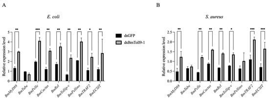 The relative expression of the signaling genes in the Toll pathway in B. mori 5th instar larvae, following a heat-inactivated (A) E. coli or (B) S. aureus feeding treatment after injection with dsBmToll9-1, compared to control larvae injected with dsGFP. Data were presented as means ± standard deviations of three biological replicates. Asterisks indicate significant differences towards the dsGFP injection groups: * p < 0.05, ** p < 0.01, and *** p < 0.001.