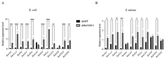 The relative expression of the immune effector genes in B. mori 5th instar larvae, following a heat-inactivated (A) E. coli or (B) S. aureus feeding treatment after an injection with dsBmToll9-1, compared to control larvae injected with dsGFP. The data were presented as means ± standard deviations of three biological replicates. The asterisks indicate significant differences towards the dsGFP injection groups: * p < 0.05, ** p < 0.01, *** p < 0.001, and **** p < 0.0001.