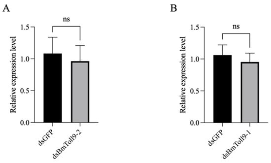 Relative expression of BmToll9-1 and BmToll9-2 genes silenced by each other in B. mori 5th instar larvae. (A) Relative expression of BmToll9-1 in dsBmToll9-2-injected larvae. (B) Relative expression of BmToll9-2 in dsBmToll9-1-injected larvae. Data were presented as means ± standard deviations of three biological replicates. ns—not significant.