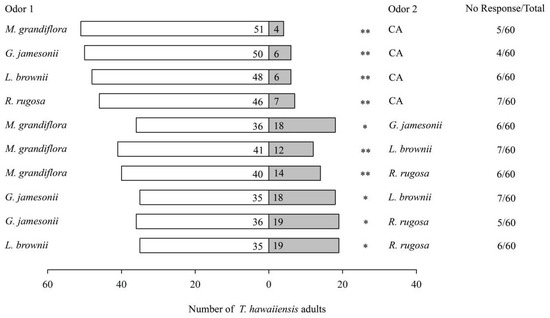 Olfactory responses of female T. hawaiiensis to different plant flowers. CA: clean air. Asterisks indicate highly significant (** p < 0.01) and significant (* p < 0.05) differences in selectivity of T. hawaiiensis between two odors by χ2 test.