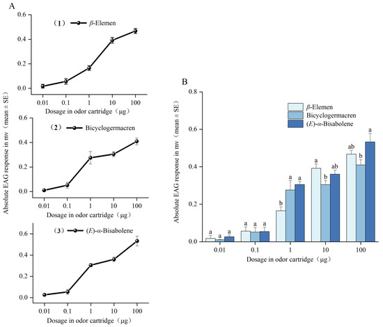 Electroantennography responses of female T. hawaiiensis. (A) EAG dose–response curves and (B) EAG responses of T. hawaiiensis to different doses of β-elemen, bicyclogermacren, and (E)-α-bisabolene. Mean values are shown. Different letters indicate significant differences among different compounds at the same dose (one-way analysis of variance followed by Tukey’s HSD test, p < 0.05).